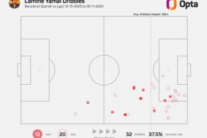 體育資訊11月12日訊 據(jù)Opta統(tǒng)計(jì),10月份國際比賽日之后,亞馬爾是五大聯(lián)賽同期嘗試過人次數(shù)最多的球員。