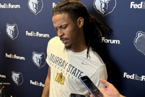 體育資訊10月2日訊 莫蘭特在訓(xùn)練營(yíng)特地穿上了母校莫瑞州立大學(xué)的T恤。在采訪的時(shí)候,莫蘭特表示自己每天都會(huì)穿莫瑞州立大學(xué)的裝備。
