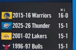 值得注意的是,過去30年開賽季前16場至少15勝的衛(wèi)冕冠軍中,2001-02賽季的湖人(15勝1負)和1996-97賽季的公牛(15勝1負)都奪冠了。