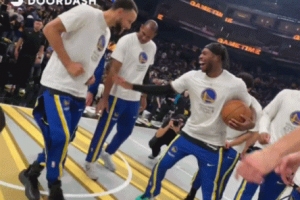 賽前,勇士眾將圍成一圈,庫里在中間翩翩起舞,妖嬈舞姿引得眾人大笑。
