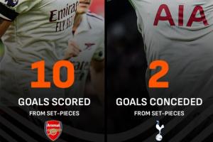 據(jù)統(tǒng)計(jì),阿森納本賽季英超通過(guò)定位球攻入10粒進(jìn)球,占總進(jìn)球的50%,這兩個(gè)數(shù)字在英超聯(lián)賽均排第一。