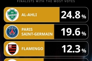 體育資訊12月10日訊 環(huán)球足球獎公布了2025年最佳男足俱樂部的投票情況,目前吉達國民24.8%領跑,巴黎、弗拉門戈二三位。