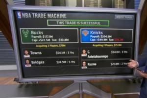 據(jù)此,ESPN薪資專家Bobby Marks進(jìn)行模擬交易,字母哥和庫(kù)茲馬去尼克斯,雄鹿得到唐斯和米卡爾·布里奇斯。