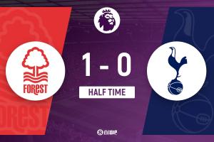 上半場(chǎng)比賽結(jié)束,諾丁漢森林1-0熱刺。