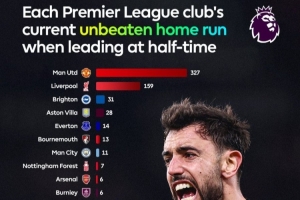據(jù)英超官方統(tǒng)計,曼聯(lián)延續(xù)著聯(lián)賽主場半場領(lǐng)先全場不敗的紀(jì)錄,場次達(dá)到327場。