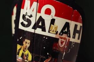 板上印有他在埃及國家隊(duì)穿10號(hào)球衣的圖案,以及利物浦主場通道里“這里是安菲爾德”的著名logo。