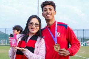 體育資訊12月31日訊 恒大足球?qū)W校全勝奪得U17精英聯(lián)賽冠軍,賽后張洪福的媽媽與兒子合影慶祝。