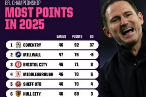 體育資訊12月31日訊 數據網站OPTA盤點了2025全年英冠積分榜,其中蘭帕德率領的考文垂積分92分,比排在次席的米爾沃爾多出16分,凈勝球更是高達37球。
