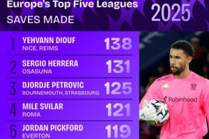 體育資訊1月1日訊 Squawka列2025年五大聯(lián)賽門(mén)將撲救次數(shù)榜,尼斯門(mén)將葉赫萬(wàn)·迪烏夫以138次居首。