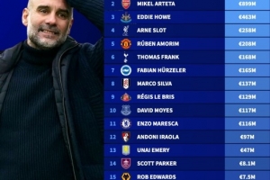 體育資訊1月1日訊 切爾西主帥馬雷斯卡在新年當(dāng)天離任,德國轉(zhuǎn)會市場盤點(diǎn)了英超主帥引援凈投入排行,瓜迪奧拉10.3億歐居首,馬雷斯卡1.16億歐位居第11位。